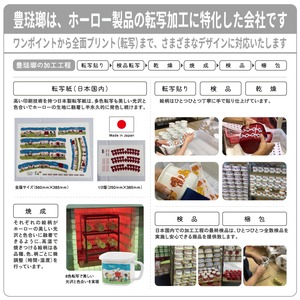 新潟県燕市で、ホーローの美しい色合いと光沢の表面に、絵柄やデザインをひとつひとつ丁寧に手で貼り施し仕上げているホーロー製品です。