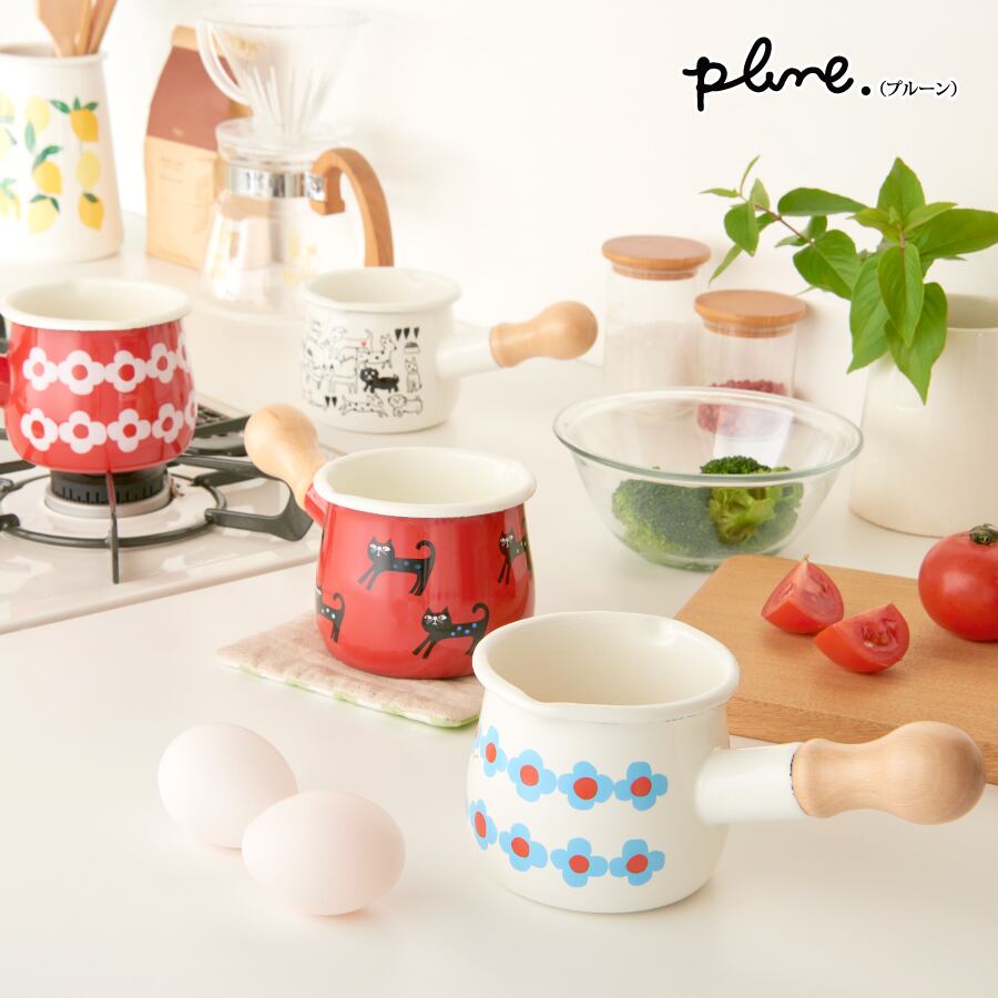 ホーローの美しい色合いと光沢に、プルーンの可愛いデザインが組み合わされキッチンを華やかに彩ります。