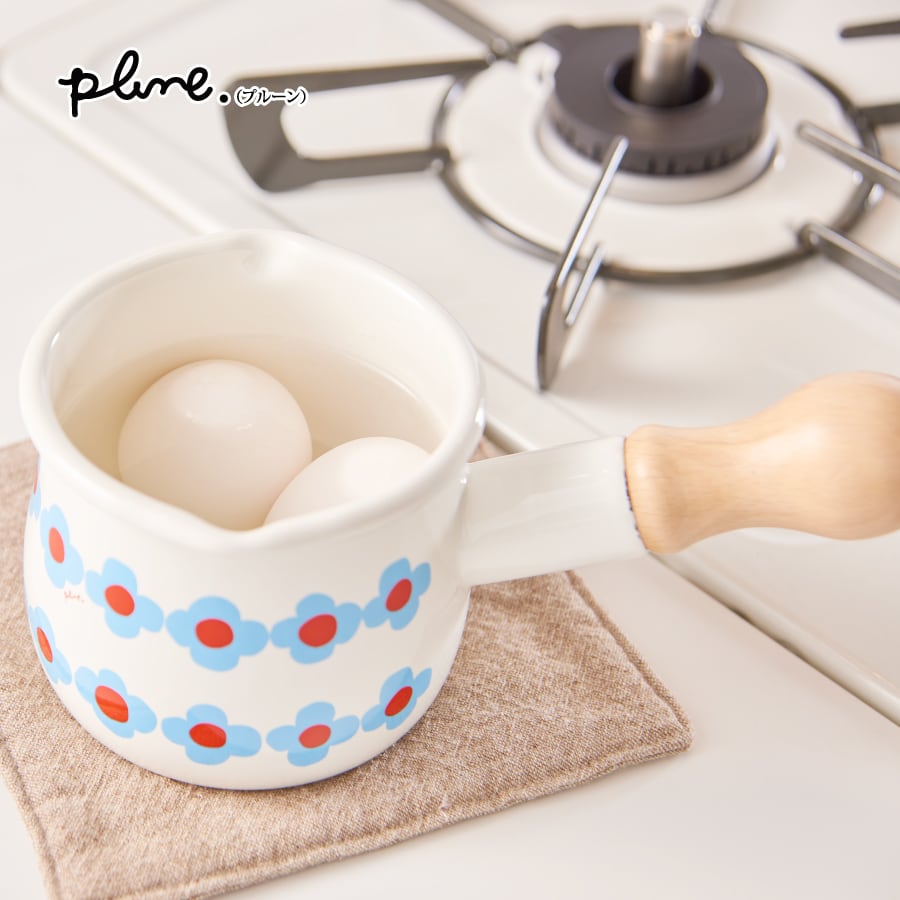 ホーローの美しい色合いと光沢に、プルーンの可愛いデザインが組み合わされキッチンを華やかに彩ります。