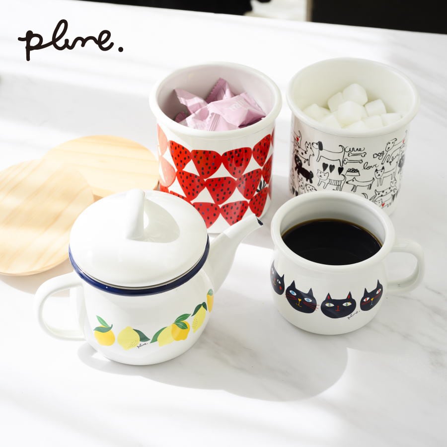ホーローの美しい色合いと光沢に、プルーンの可愛いデザインが組み合わされキッチンを華やかに彩ります。